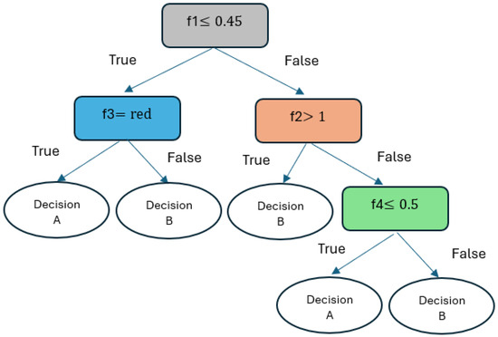 Figure 13 shows a simple visualization of a DT with four features. The tree comprises root, decision, and leaf nodes (i.e., prediction nodes). Each non-leaf node pertains to a particular feature () and a corresponding conditional relationship. For input instances, the decision tree follows a path to a leaf node that contains a prediction.