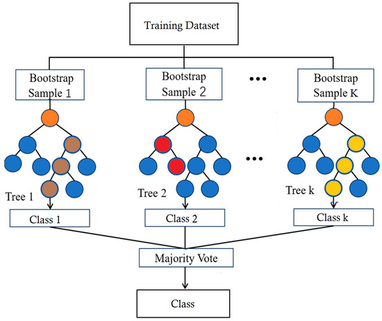 Given that a random forest comprises T decision trees, the trees’ prediction outputs are denoted by . Therefore, each bootstrap sample produces DT models, as shown in Figure 14. Based on color-coded nodes in the figure, orange nodes are root nodes that start the splitting process based on the most significant feature. Blue nodes are intermediate splits, and red nodes reflect unique decisions from bootstrap sampling. Yellow and brown nodes are leaf nodes where final class decisions are made. Finally, the class decisions are made, contributing to the majority vote in the RF. An increasing number of trees causes a random forest’s generalization error to converge to a limit. The individual trees’ strengths and correlations with one another impact this error.