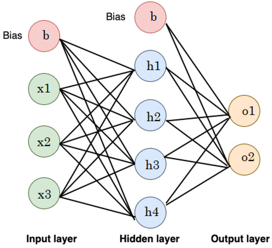 where and correspond to the weight and input, respectively; b is the bias of the ANN; and n is the number of neurons. Figure 15 shows an illustrative example of a feedforward NN consisting of an input layer (3 neurons), hidden layer (4 neurons), and output layer (2 neurons). The neurons in the input layer represent the features, while the neurons in the output layer represent the output class.