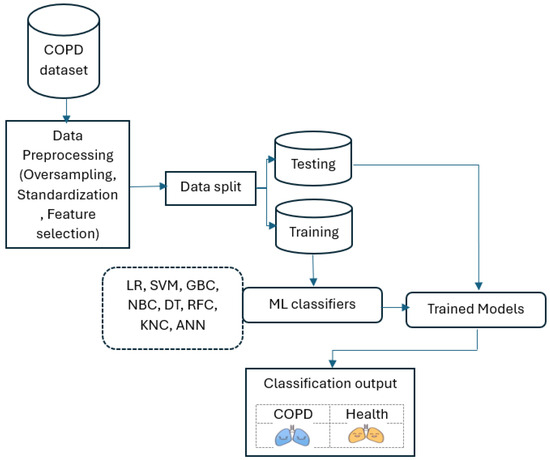 Early diagnosis of COPD is crucial for effective management and improved patient outcomes by leveraging various machine learning classifier models, such as support vector machine (SVM), decision tree (DTs), random forest classifier (RFC), logistic regression (LR), Gradient Boosting Classifier (GBC), Gaussian naïve Bayes (GNB), artificial neural networks (ANNs), and K-nearest neighbors (KNN). These machine learning models are employed using the Scikit-learn library, built on Python to address our classification task. Like numerous others in the literature, this study uses respiratory data to train systems to extract essential features for diagnosis and prediction. As ML technology advances, especially in diagnosing various diseases [29,30,31,32], it holds immense promise to enhance the accuracy and accessibility of COPD screening and diagnosis, ultimately improving patients’ lives worldwide.