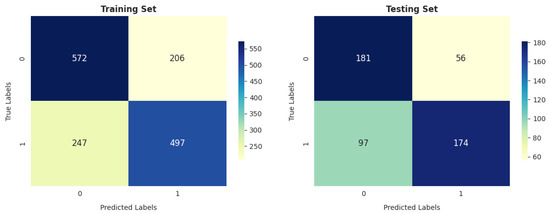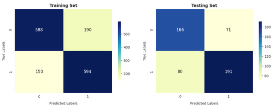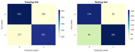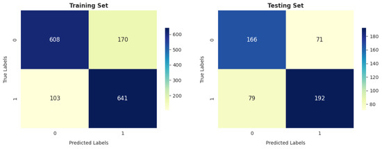 The ANN model’s performance is comparable to that of GNB on the training and testing sets, especially in terms of the total number of correctly classified instances (1046 out of 1522 and 341 out of 508 in training and testing, respectively).