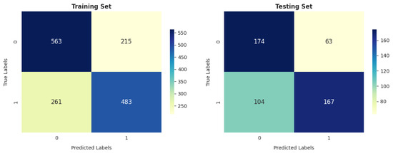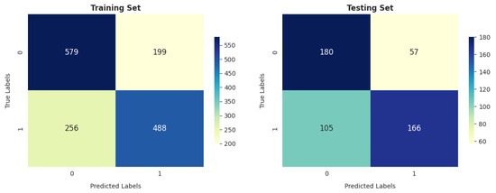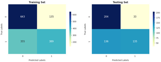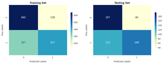 The DT and SVM models show similar trends in terms of performance on the training and testing sets, as shown in Figure 20 and Figure 24, with 1067 correctly identified instances and 455 incorrectly identified instances in training.
