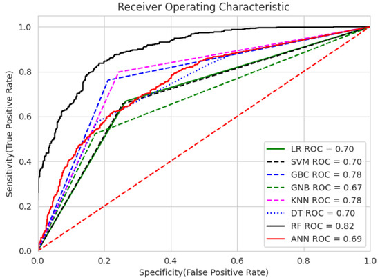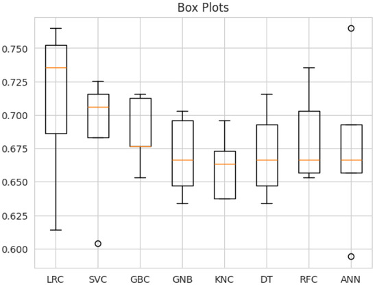 Furthermore, Figure 27 and Figure 28 show the Receiver Operating Characteristic curves (ROC curve) and box plots, respectively, for the utilized machine learning classifiers. RFC has achieved the best ROC value of 0.82 compared to others, where a greater AUC indicates better class discrimination. Other models, such as the gradient boosting classifier (GBC) and KNN, also demonstrate reasonable performance, with AUC values close to 0.78. Generally, a model with a curve closer to the plot’s top-left corner indicates better performance.