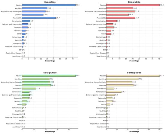 Figure 2 illustrates the proportion of GI AEs reported for exenatide, liraglutide, dulaglutide, and semaglutide. The four most common GI AEs were frequently reported with semaglutide use and included nausea (50.3%), vomiting (30.2%), abdominal discomfort/pain (24.4%), and diarrhea (25.7%). The most frequently recorded serious AE, pancreatitis, was highest with exenatide use (26.7%), while reports of delayed gastric emptying were more frequent with semaglutide use (8.2%).