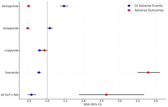 Safety signals of gastrointestinal adverse events and adverse outcomes associated with GLP-1 RAs. ROR: reporting odds ratio; GI: gastrointestinal; GLP-1 RAs: glucagon-like peptide-1 receptor agonists.