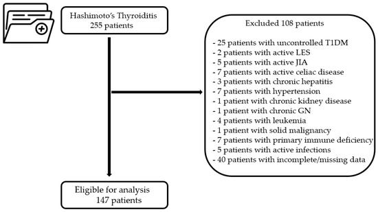 This retrospective, cross-sectional study was conducted at the Children’s Emergency Hospital “Louis Turcanu” Timișoara, Romania. The medical records of 255 patients diagnosed with Hashimoto’s thyroiditis between 1 January 2015, and 31 December 2023 were retrieved and systematically evaluated. The inclusion criteria were an age of 18 years or younger and a diagnosis of Hashimoto’s thyroiditis. Patients with concurrent active autoimmune diseases, hepatic, cardiovascular, renal, hematologic, or myeloproliferative disorders, as well as those with active infections or incomplete laboratory investigations, were excluded from the study, as illustrated in Figure 1.