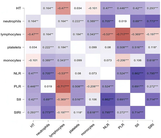 Correlation between CBC parameters and indices and HT diagnosis. HT, Hashimoto’s thyroiditis; NLR, neutrophil/lymphocyte ratio; PLR, platelet/lymphocyte ratio; SII, systemic inflammation index; SIRI, systemic inflammation response index. The significance levels were marked as *** p < 0.001, ** p < 0.01, and * p < 0.05. The accompanying figure employs a color gradient to depict significance levels, with darker shades representing more substantial associations and lighter shades indicating lesser degrees of statistical significance.