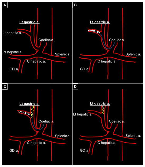 Schematic representation of flow diversion from the left hepatic artery to the left gastric artery in a case of gastrohepatic trunk anatomical variation, with the embolization target being the left gastric artery. (A) Gastrohepatic trunk variation: left hepatic artery originating from left gastric artery. (B) A microcatheter is positioned via the gastrohepatic trunk into the left hepatic artery and temporary embolization is performed by injection of Embocept-S® microparticles. (C) The microcatheter is retrieved proximally, before the bifurcation, and definitive embolization of the left gastric artery is obtained with microparticles. (D) Patency of the left hepatic artery is restored, with Embocept-S® microparticles being reabsorbed in 35 min, while the target (left gastric artery) is definitely embolized.