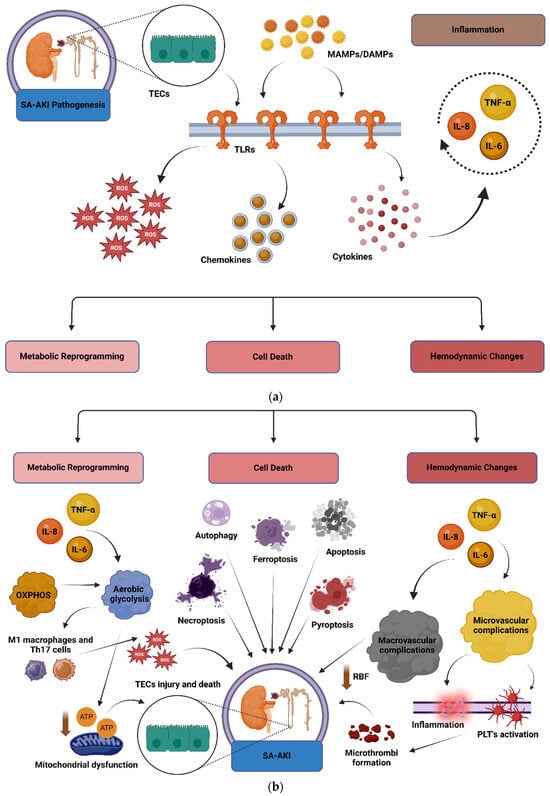Figure 1. (a). The vital role of inflammation in the development of SA-AKI. The activation of TLRs on kidney TECs by MAMPs or DAMPs triggers the production of cytokines, chemokines, and ROS, initiating a systemic inflammatory response. This culminates in a cytokine storm, which promotes renal injury through the action of pro-inflammatory mediators such as IL-6, IL-8, and TNF-α, ultimately contributing to SA-AKI. Inflammation also influences metabolic reprogramming, driving a shift towards glycolysis, enhances cell death pathways such as apoptosis, necroptosis, and pyroptosis, and disrupts hemodynamic stability, including alterations in renal blood flow and microvascular function, which together exacerbate kidney injury [6,7,8,9,10,11]. Abbreviations: CCL-2: Chemokine C-C motif ligand 2; DAMPs: Damage-Associated Molecular Patterns; IL: Interleukin; MAMPs: Microbial-Associated Molecular Patterns; ROS: Reactive Oxygen Species; SA-AKI: Sepsis-Associated Acute Kidney Injury; TECs: Tubular Epithelial Cells; TLR: Toll-Like Receptor; TNF-α: Tumor Necrosis Factor-alpha. Created in BioRender. Kounatidis, D. (2024) https://BioRender.com/o88k763 (accessed on 8 December 2024). (b). Metabolic reprogramming, cell death, and hemodynamic alterations during SA-AKI. During sepsis, inflammatory cytokines (e.g., TNF-α, IL-6, IL-1β) are produced in response to infection and alter cellular metabolic pathways in immune cells and renal TECs. This inflammatory milieu induces a metabolic shift from OXPHOS to aerobic glycolysis, a process known as the Warburg effect, which supports rapid energy production in response to cellular stress. Activated immune cells, such as M1 macrophages and Th17 cells, heavily rely on aerobic glycolysis to meet the high energy demands of cytokine production and other immune functions. Glycolysis also promotes the production of ROS, which amplifies inflammation. TECs, which normally depend on mitochondrial OXPHOS for ATP production, experience mitochondrial dysfunction during inflammation. This dysfunction induces a metabolic switch to glycolysis to conserve energy under hypoxic and inflamed conditions. However, this shift leads to reduced ATP production, impairing cellular processes and repair mechanisms, ultimately resulting in TEC injury and death. While initially protective, prolonged metabolic reprogramming contributes to energy deficits and impaired repair, culminating in cell death, such as apoptosis and ferroptosis. Additionally, persistent inflammation and platelet activation cause macrovascular and microvascular alterations, including impaired renal blood flow and microthrombi formation, which exacerbate ischemia and worsen SA-AKI [10,11,12,13,14,15,16,17,18,19,20,21,22,23,24,25,26,27,28,29,30,31,32,33,34]. Abbreviations: ATP: Adenosine Triphosphate; IL: Interleukin; OXPHOS: Oxidative Phosphorylation; PLTs: Platelets; ROS: Reactive Oxygen Species; SA-AKI: Sepsis-Associated Acute Kidney Injury; TECs: Tubular Epithelial Cells; Th17: T helper 17; TNF-α: Tumor Necrosis Factor-alpha. Created in BioRender. Kounatidis, D. (2024) https://BioRender.com/i25a010 (accessed on 8 December 2024).