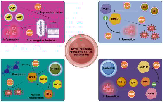 The Danlou tablet (DLT), a herbal preparation containing various plant extracts, has also shown anti-inflammatory effects in a mouse model of SA-AKI. According to Yu et al., DLT ameliorated SA-AKI by inhibiting the poly (ADP-ribose) polymerase-1/high-mobility group box 1 (PARP1/HMGB1) pathway, which plays a role in the inflammatory response [95,96,97]. In another preclinical study, Li et al. evaluated the aldose reductase inhibitor epalrestat in a rat model of SA-AKI. Epalrestat, known for its use in diabetic nephropathy, mitigated inflammation by inhibiting the protein kinase C (PKC)/NF-κB pathway, resulting in reduced expression of cytokines such as IL-6 and TNF-α and attenuated kidney damage [98]. Given its established use in diabetic patients, epalrestat may hold promise for human trials in SA-AKI.