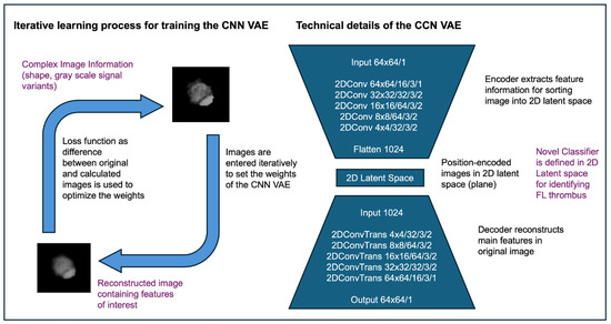 Computational algorithms for identifying and quantifying the presence of FL thrombosis may be advantageous for aiding in the medical diagnosis by providing quantitative assessment of the medical image data. The recently developed artificial intelligence (AI) algorithms, those specifically applying neural networks to patient data, provide a new powerful set of technologies, which are able to classify complex data interrelationships [7,8,9,10,11]. In particular for medical imaging data, AI-based computer-assisted support has been demonstrated to be of great interest, as the image data content can be analyzed and quantified automatically or with only minimal user interaction [12]. Traditionally, convolutional neural networks perform classifications by using image datasets that are manually annotated, which requires effort for the curation of this data. Alternatively, unsupervised learning algorithms offer a promising solution, as these algorithms can discover hidden patterns and structures in data without the need for labeled training data. One of these algorithms, the variational autoencoder (VAE), condenses information into the so-called latent space with a considerably reduced dimension [10,13,14,15,16,17]. To process two-dimensional image data, this latent space uses the output of a 2D convolutional network as input and serves as the input of another 2D convolutional network, which recreates the original images.