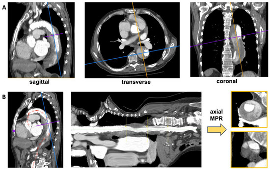A centerline in the patient aortic lumen was created by manually defining a curved centerline using the 3 orthogonal MPR planes (sagittal, coronal, axial) with the 3D curved MPR tool in Horos (Horos Project, Annapolis, MD, USA; version 4.0.0 RC5). Images were then reconstructed perpendicular to the defined centerline so that the patent aortic lumen was centered in these images with the smallest possible diameter.