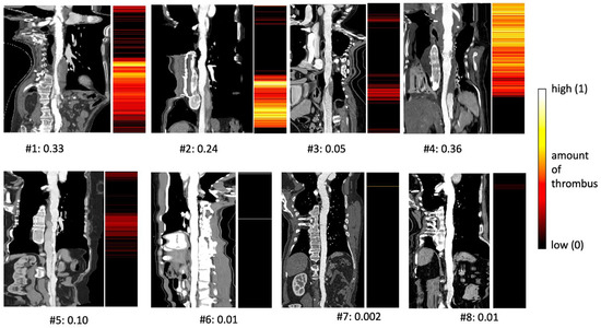 High amounts of thrombus were correctly identified in the aortic arch and SG area in #4 and in the downstream aorta in #1 and #2 (Figure 4). In the case of patent FL, as seen in the abdominal aorta in #3 and #5, agreeable results were achieved, showing low amounts of thrombus. Partial thrombosis resulted in red color coding, which indicates a low amount of thrombogenic material. In control cases #6–8, with a completely patent lumen and no residual dissection, no thrombus was detected by the algorithm.