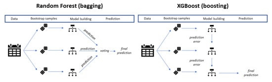 XGBoost (boosting algorithm) differs from RF (bagging algorithm) since it uses a gradient boosting framework that builds trees sequentially in such a way as to ensure that the errors of the previous tree are reduced; on the contrary, RF builds trees parallelly and combines results at the end of the process training of each classifier (Figure 1) []. Moreover, the XGBoots algorithm includes regularization as part of the learning objective [].