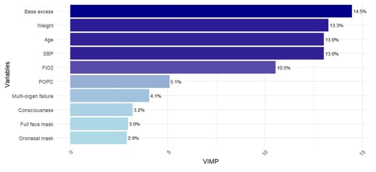 From a clinical standpoint, the predictors were entered into the model, and all their additive and interaction effects were considered, thanks to the application of MLTs rather than the simple additive logistic regression model []. The VIMP highlights that base excess in the first hour, age at admission, weight at admission, SBP in the first hour, and FiO2 in the first hour are the predictors that contributed more to the NIV failure prediction. Interestingly, base excess, weight, age, and SBP showed no statistically significant differences in distributions between the failure and success groups, as shown in Table 1. However, they emerged as the most important variables in the VIMP analysis when included in the RF model. This underscores the importance of accounting for variable interactions and non-linear relationships in predicting outcomes for complex patients, such as children in the PICU setting. Nevertheless, base excess, SBP, and FiO2 stand out as both reasonable and literature-supported predictors of NIV failure [,,]. In fact, base excess is an indicator of metabolic status, with deviations often reflecting systemic acidosis and poor respiratory compensation []. Similarly, unstable SBP suggests a hemodynamic compromise [,], while elevated FiO2 requirements point to significant hypoxemia and respiratory strain [].