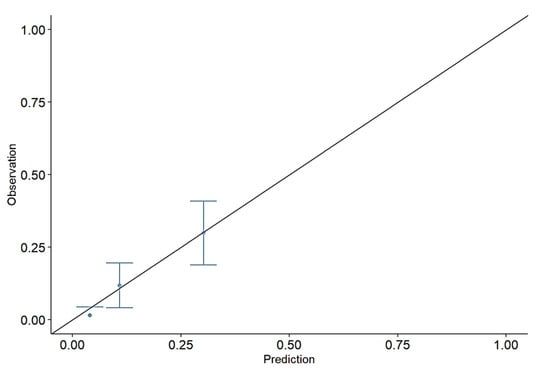 Finally, the calibration metrics were estimated by the RF model equal to Eavg = 0.2, E50 = 0.11, and E90 = 0.61. The corresponding calibration plot is reported in Figure 3.