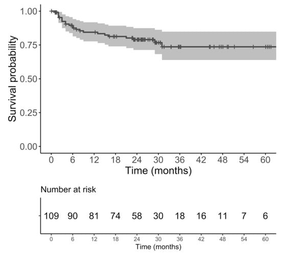Using Kaplan Meier analysis, the PCFS probabilities were 92.4% (95%CI: 87.4–97.6) at 3 months, 87.5% (95%CI: 81.4–94.1) at 6 months, 84.4% (95%CI: 77.7–91.7) at 1 year, and 79% (95%CI: 71.3–87.4) at 2 years (Figure 2).