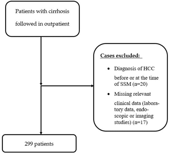 During the study period (January 2020–May 2024), 344 patients were enrolled. Among the 344 patients, 20 were excluded due to an HCC diagnosis at the same time of performing LSM and SSM or in the 6 months prior; 17 due to missing relevant clinical data; 8 due to other reasons; 5 due to a failed SSM examination because of obesity (BMI > 35) and large volume ascites; 1 due to previous splenectomy; and 2 due to liver congestion secondary to heart failure. The final number of patients included was 299 (Figure 1).