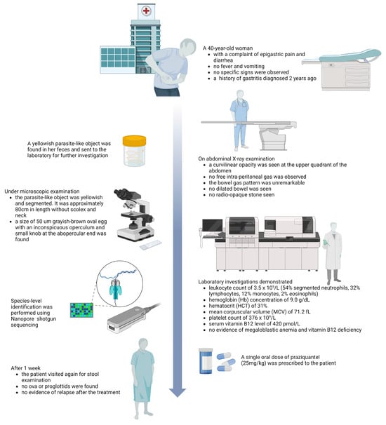The misidentification of the parasite may introduce errors in understanding the geographical distribution of the parasite, clinical presentation, pathogenesis and the epidemiology of the parasitic diseases. This is because different species of the same genus or family may have a different intermediate host and reservoir, clinical presentation and geographical distribution [10]. However, parasites are often incorrectly reported as the most common or most well-recognized species that infect humans instead of the actual species infecting the patient due to inadequate expertise [10]. Dibothriocephalus spp. is one of the most commonly misidentified parasites [10]. The accuracy of species identification of Dibothriocephalus based on morphological examination varies because inadequate morphology experience of the technician may lead to misidentification and inaccurate diagnosis [7]. The life cycle of Dibothriocephalus spp. is complex. It involves a wide diversity of freshwater and marine fish as the intermediate hosts, which are commonly pike, perch, burbot and char for D. latus and Pacific salmon (e.g., Oncorhynchus masou, O. keta, O. gorbuscha and O. nerka) for D. nihonkaiense. Due to the high morphological similarity, it is challenging to distinguish D. latus from D. nihonkaiense accurately using solely morphology-based diagnostics. Moreover, due to marketing globalization, fish may be transported from their original fishing grounds to other selling locations. As a result, the imported parasite species may vary according to trade between countries, and hence the geographical distribution of Dibothriocephalus is no longer area-restricted [11]. The molecular identification of the parasite is crucial for accurate species identification. However, many commercial and laboratory-developed tests may not detect all medically important parasites [10]. Moreover, although molecular assays such as PCR designed for distinguishing individual Dibothriocephalus species have been developed, they are not widely available in routine laboratory testing. Thus, sequencing-based methods have emerged as promising diagnostic tools and are necessary to confirm the species to understand the distribution and origin of infection of Dibothriocephalus spp. during epidemiological investigations. Recently, next-generation sequencing (NGS) has emerged as a promising diagnostic tool for the detection of any potential pathogens in various species types [12]. In this case report, an unbiased shotgun NGS using the Oxford Nanopore platform was used to identify the parasite at the species level. Oxford Nanopore sequencing technology is the fourth generation of sequencing technology, which allows the rapid identification and detection of infectious diseases [13]. Compared to first-generation sequencing technology such as Sanger sequencing, Nanopore sequencing allows fast real-time sequencing for the rapid diagnosis of infectious diseases. The portability of the Nanopore system, inexpensive sequencing device, relatively simple library preparation procedures and the real-time onboard basecalling make Nanopore sequencing suitable for on-site applications [14]. To the best of our knowledge, this case report is the first report using Oxford Nanopore sequencing technology in the species identification of Dibothriocephalus spp. This case also highlights the use of Oxford Nanopore NGS as a tool for accurate onsite parasite identification when accurate morphological diagnosis is not applicable.