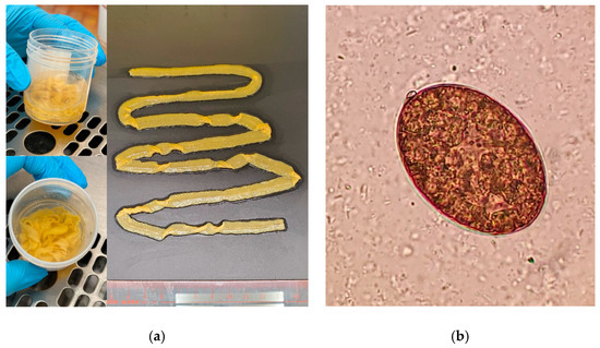 (a) The incomplete strobila of Dibothriocephalus nihonkaiense without scolex and neck (80 cm in length). The proglottids are more broad than long; (b) grayish-brown oval Dibothriocephalus nihonkaiense egg with a small abopercular knob (400×).