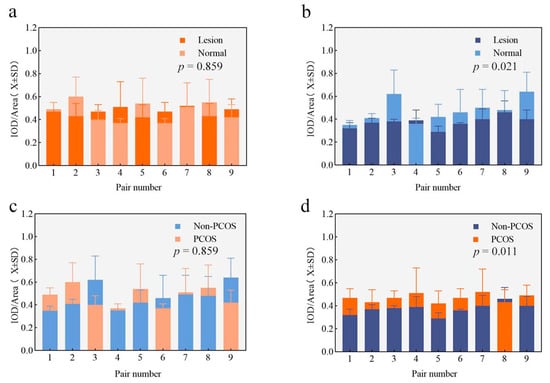 | PCOS (n = 9) | Non-PCOS (n = 9) | p Value * | PCOS (n = 9) | Non-PCOS (n = 9) | p Value * | |