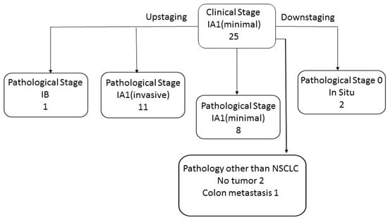 Out of the eight lung cancer clinical IA1/IA1(invasive) tumors, one was upstaged (IA2) and two tumors were downstaged to stage 0 (in situ). Five tumors reserved their overall clinical stage IA1 on pathological staging (three remained IA1 (invasive) and two were defined as IA1 (minimal)) (Figure 3).