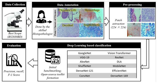 The proposed framework for the classification of histopathology images began with data collection, where 5666 histopathological images were acquired under an IRB-approved protocol at Atia Hospital, Karachi, Pakistan. These images, sized 1280 × 729 pixels, contain representative tissue samples from clinical conditions. Following data collection, expert pathologists annotated the dataset to ensure reliable and accurate labels. Cases with discrepancies among pathologists were excluded to maintain consistency and minimize bias in the dataset. To standardize the data, preprocessing was performed by dividing the images into patches of size 224 × 224 pixels, ensuring uniform input dimensions for deep learning models. Patches with less than 50% tissue coverage were filtered out to enhance the dataset’s quality and relevance for training. Deep learning models were trained on the processed dataset, employing a 70/30 patient-level training-to-testing split to avoid data leakage. Model evaluation was carried out using precision, recall, and F1-score, offering a comprehensive assessment of classification accuracy and generalizability. This framework ensured systematic data handling and robust model development for histopathological image classification. Figure 1 presents the generic framework employed in this study, and the following subsection provides detailed descriptions of each step.