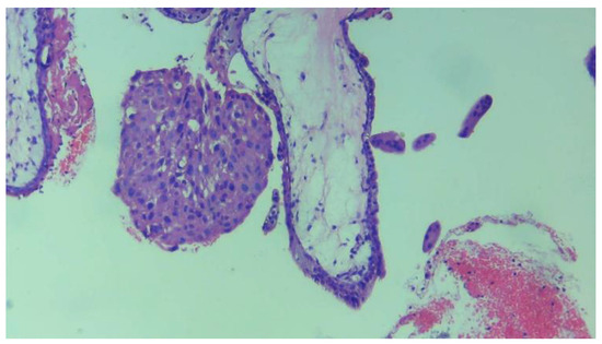 Trophoblastic tissues [16] refer to the cells that form part of the outer layer of the blastocyst in early embryonic development. These tissues play a crucial role in the formation of the placenta and are responsible for implantation in the uterine wall, nutrient exchange, and secretion of hormones necessary for maintaining pregnancy. Trophoblastic cells can differentiate into various cell types, primarily contributing to the development of the chorion and the placenta, essential for fetal–maternal interaction. Automated detection of trophoblastic tissues through AI and deep learning models offers several advantages in clinical diagnosis and research, especially in pregnancy-related conditions such as trophoblastic diseases, placental abnormalities, and implantation issues. Deep learning models can provide consistent and objective assessments of trophoblastic tissues, reducing human diagnostic errors. AI can quickly analyze large datasets, highlighting abnormal growth patterns that may indicate trophoblastic tumors or molar pregnancies. Trophoblastic cells are key to placental development. AI models can assist in identifying abnormalities in the trophoblast layer, such as insufficient trophoblastic invasion, which can lead to pregnancy complications like preeclampsia, placental insufficiency, or intrauterine growth restriction (IUGR). AI can quantify the invasion of extravillous trophoblasts into the maternal decidua and blood vessels, helping to assess whether proper placentation has occurred. Inadequate invasion can lead to poor placental perfusion and subsequent fetal growth problems. Figure 6 shows a sample of trophoblastic tissue from the dataset.