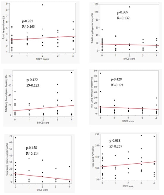 In our study, we identified 16 [35.5%] patients with hyperlucency exceeding 20% [smokers—6 patients, non-smokers—10 patients], and this can be classified as an emphysema-predominant phenotype. Additionally, 7 [15%] patients presented with combined reticular shadows and honeycombing above 20%, and can be classified as a fibrosis-predominant phenotype, and 2 [4.4%] of the subjects satisfied the criteria for combined emphysema and fibrosis [24,25,26,27,28]. About 33% of patients had significant ground-glass opacities and follow-up studies are needed to understand the natural history of these patients (Figure 3).