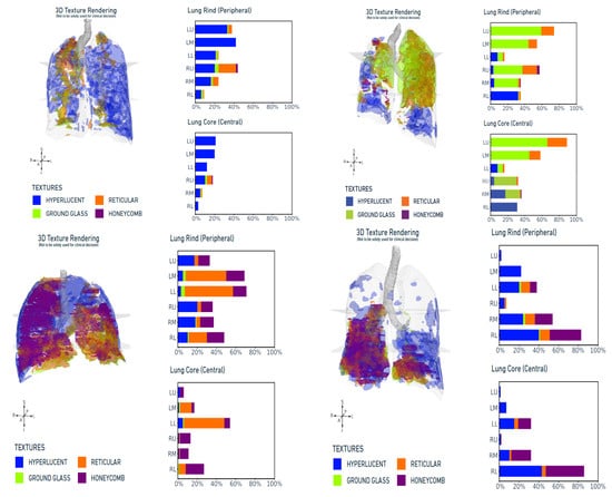 QA [quantitative analysis] was performed in the set of images with a standard reconstruction algorithm by using Imbio LTA [based on the algorithm of CALIPER—Computer-aided Lung Informatics for Pathology Evaluation and Rating], a computational platform for the near-real-time characterization and quantification of lung parenchymal patterns on CT scans [18,19]. Lung parenchymal patterns include normal, hyperlucent, ground glass [GG], reticular, and honeycombing. Imbio LTA provided the Total Lung Volume, relative volumes, and absolute volumes of lung patterns, and their regional distribution within three different lung zones [upper, middle, lower] in each lung. The platform provided a fast output of the DICOM series, as well as a PDF file in which each lung pattern was colored differently, allowing the evaluation of disease extent, composition, and location at a glance. Each QA was performed automatically for up to 20 min [20]. Among the patterns detected by AI, hyperlucency is suggestive of air-trapping and alveolar destruction, while ground-glass opacity suggests active alveolitis and early interstitial inflammation. Both reticular and honeycombing are findings associated with fibrosis, while the former suggests interlobular interstitial thickening and the latter interstitial fibrosis with lung destruction and dilation of peripheral airspaces. The pulmonary vascular volume [PVV] refers to the total volume of all visible arteries and veins in the lungs, encompassing both blood and vessel walls. PVV is an important metric for assessing the severity of various lung disorders, such as pulmonary hypertension [PH] and other pulmonary vascular conditions [21,22].