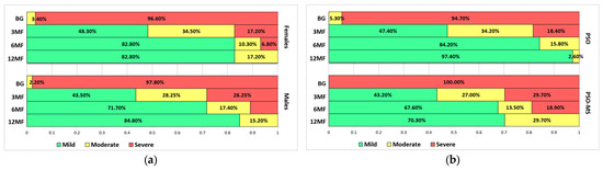 During the 1-year period of research, the overall number of patients with mild PASI levels increased for both the PSO and PSO-MS groups, mostly in accordance with a decreasing trend of patients within the severe group (Figure 1).
