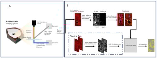 Flowchart of the imaging process and detection of fat vacuoles. (A) Images of unstained liver tissue samples were obtained using an SHG/TPEF imaging device (Genesis ® 200). (B) All holes in the input images were detected in the TPE channel and classified using a pre-trained decision tree.