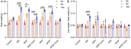 After induction for 8 and 16 weeks, mouse body weight and liver/body weight ratio in the different model groups increased compared to values at week 0, especially in the WD and WDF groups (Figure 2; p < 0.001).