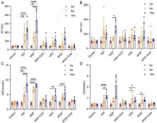 The serum levels of ALT, AST, CHO, and LDL in mice at 8 and 16 weeks were higher than those at 0 weeks, especially in the WD and WDF groups. However, in the mouse models administered CCl4, there was no significant difference in the levels of CHO and LDL at different time points (Figure 3).