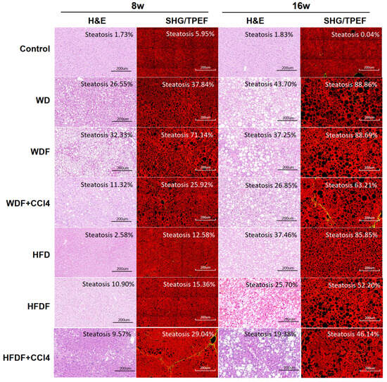 Representative images of H and E staining and SHG/TPEF at 8 and 16 weeks in the control group and six MASLD mouse models. In the H and E staining image, the percentages of vacuole area were shown as the percentages of steatosis, while in the SHG/TPEF image, the red channel represents TPEF, and the green channel represents SHG (collagen structure); the percentages of black fat vacuoles and surrounding affected areas were identified as the percentages of steatosis. H and E, Hematoxylin and eosin; SHG/TPEF, second-harmonic generation/two-photon-excited fluorescence; w, week; CCl4, Carbon tetrachloride; WD, Western diet; WDF, WD with high-fructose drinking water; WDF + CCl4, WDF plus intraperitoneal injection of CCl4; HFD, high-fat diet; HFDF, HFD with high-fructose drinking water; HFDF + CCl4, HFD plus intraperitoneal injection of CCl4; Bar: 200 μm.