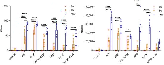 Steatosis can be classified as macrovesicular (large lipid droplets) or microvesicular (small lipid droplets) []. After 8 weeks, all WD- and WDF-fed mice exhibited extensive micro- and macro-vesicular steatosis in zone 3 of the liver, whereas some HFD- and HFDF-fed mice did not exhibit these features until 16 weeks of treatment, at which point significant micro- and macro-vesicular steatosis was observed in 80–90% of hepatocytes across all lobules region in all mouse models (Figure 4). In the CCl4-treated groups (WDF + CCl4 and HFDF + CCl4), macrovesicular steatosis was the main steatotic feature, and steatosis was milder than that in the other groups (Figure 4). Compared to mice at 0 weeks, at 8 and 16 weeks, the grade of steatosis was significantly increased according to the NASH CRN score assessment. However, there was no significant difference in the grading of steatosis between the 8 and 16-week time points using this semi-quantified and subjective scoring approach (Table 1).