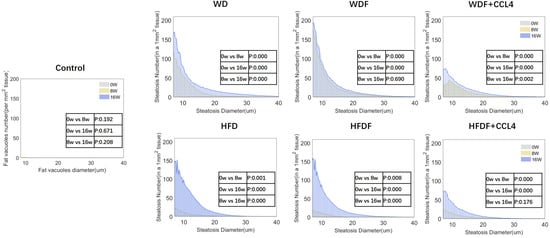 Fat vacuole distribution at different time points (0, 8, and 16 weeks) among the control group and six MASLD mouse models. The x-axis represents the diameter of the fat vacuoles (µm), whereas the y-axis represents the number of fat vacuoles per unit area (mm2), corresponding to the diameter of the fat vacuoles. Note: The comparison between different weeks of the same model is based on the difference in fat vacuole distribution according to their diameter per unit area. The p-value of the KS test is shown in the figure. w, week; CCl4, Carbon tetrachloride; WD, Western diet; WDF, WD with high-fructose drinking water; WDF + CCl4, WDF plus intraperitoneal injection of CCl4; HFD, high-fat diet; HFDF, HFD with high-fructose drinking water; HFDF + CCl4, HFD plus intraperitoneal injection of CCl4.