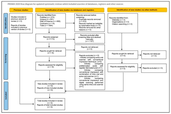 A preliminary electronic data search resulted in 1584 hits, of which 412 records were observed to be duplicated and removed. The titles and abstracts of the remaining 1172 records were reviewed, of which 1157 were omitted as they did not meet the selection criteria. Fifteen studies were evaluated for eligibility. The bibliography of these fifteen studies (n = 15) was searched manually for any additional articles, but no new relevant studies were found. The full text of these fifteen studies was reviewed, and five reports were excluded. In three of the excluded studies, extraoral scanners were compared to conventional impression techniques, whereas another one compared prefabricated posts to digitally fabricated posts and conventional impressions to a combination of intraoral and extraoral scanners. In the final excluded study, the authors performed conventional impressions and digital scanning using the same IOS. So, overall, nine studies (n = 9) were selected for qualitative analysis (Figure 1).