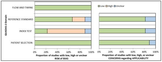 The quality of the articles included in this review was critically analyzed using the Quality Assessment and Diagnostic Accuracy Tool (QUADAS-2) [44,45]. It effectively evaluates both the risk of bias and applicability concerns. The risk of bias component consists of four key domains, namely, patient selection, index test, reference standard, and flow and timing, whereas, the applicability concern component includes three key domains: patient selection, index test, and reference standards.