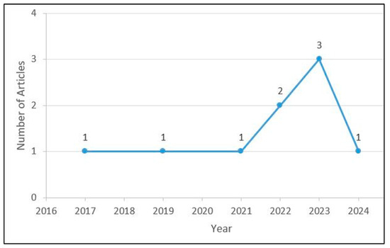 Out of the nine studies included in this review, eight were published in the last five years (between 2019 and 2024) [5,12,35,36,37,38,39,40], whereas one [41] was published seven years ago, in 2017 (Figure 3). Two out of nine studies were conducted in Egypt [12,38], whereas one study each was conducted in Italy [41], Iran [37], Solvenia [5], Germany [36], Turkey [35], France [40], and the USA [39] (Table 3).