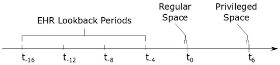 In this paper, the regular space was information available at or before time , which was when qSOFA was recorded as being equal to 1. Anything occurring after was considered the privileged space. An illustration is provided in Figure 1 to show where the regular and privileged space for this particular experiment appeared on a timeline.