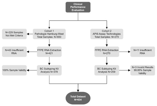 Out of the 920 patient specimens, 229 were excluded from further analysis due to not meeting inclusion criteria (the reasons for withdrawal are detailed in Supplementary File S2). The inclusion criteria consisted of confirmed invasive breast cancer specimens (CNB or resected FFPE tissue) with >20% tumor content, not older than 18 months, and with documented ethics and informed consent or a waiver for research. An additional 54 specimens were excluded due to insufficient RNA. Testing with the APIS BC Subtyping Kit was conducted at two different locations: APIS Assay Technologies (259 specimens; cohort 2) and MVZ Prof. Dr. med. A. Niendorf Pathologie Hamburg-West GmbH (378 specimens; cohort 1) (Figure 1).