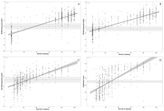 The agreement between IHC and RT-qPCR for MKI67/Ki67 was moderate with a diagnostic sensitivity (PPA) of 79.86%, indicating that expression at the RNA level does not always translate to observable protein by IHC. However, Ki67 staining reproducibility has been widely discussed in the literature [9,16], with significant inter- and intra-laboratory variability observed for this marker. Challenges of IHC processing and analytical issues in scoring IHC slides have resulted in a “Grey Zone” for Ki67 scoring being suggested, where only IHC values below 5% or above 30% should be considered as low or high expression, respectively, as reproducibility within this range is particularly poor [16]. A substantial overlap in RT-qPCR results between tumors categorized as high and low with IHC can be observed, although the populations are clearly distinct, as higher ΔCt values correspond to increased IHC % staining. Consistent with previous studies, most of the discordant cases for this marker were identified as false positive (i.e., false high) cases [15].