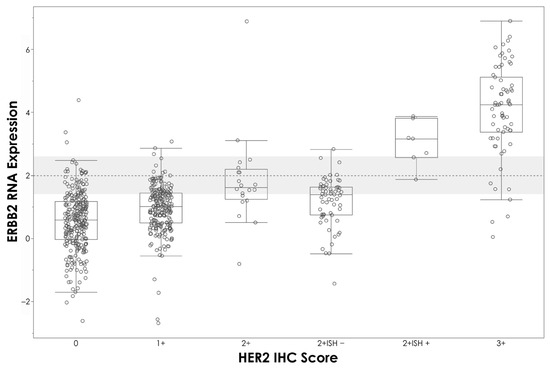 The overall agreement between mRNA expression levels determined by APIS BC Subtyping Kit and IHC is shown in Table 3. A strong correlation between ∆Ct values and the percentage of staining with IHC was observed for ESR1/ER (R2 = 0.664, p < 0.0001) (Figure 2A) and PGR/PR (R2 = 0.663, p < 0.0001) (Figure 2B). A moderate level of correlation was noted between MKI67 ΔCt and the percentage of staining with IHC (R2 = 0.414, p < 0.0001) (Figure 2C), and between Ki67 IHC staining and proliferation score (R2 = 0.472, p < 0.0001) (Figure 2D). A clear stratification of ΔCt by HER2 IHC status was noted (Figure 3). Patients assigned HER2 2+ status were classified into negative and positive groups by the APIS BC Subtyping Kit in line with the results obtained from ISH testing. This result is of utmost importance, as the anti-HER2 neo-adjuvant therapy decision is based on the results provided by this test. The APIS BC Subtyping Kit accurately detects HER2 expression (with IHC 2+/ISH+ and IHC 3+ cases defined as positive). ERBB2 mRNA expression was detected by the APIS BC Subtyping Kit in a subset of patients with 0 and 1+ IHC HER2 scores, highlighting the continuous nature of ERBB2 expression, and providing an opportunity to enhance HER2 stratification into a HER2-low category. Notably, the majority of cases showing disagreement between ER and PR calls made by APIS BC Subtyping Kit and IHC status were found to be in close proximity to their respective ΔCt cut-off values. Considering the binary nature of positive and negative results for ER and PR and the inherent variability of quantification methods, the biological implications of this discordant calling require further investigation.