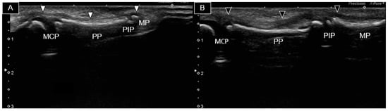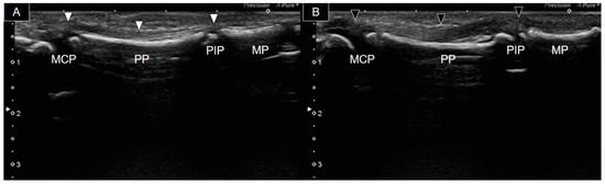 Ultrasound image of the palmar side of the fourth right (A) and left (B) fingers. The white arrowhead indicates the right finger flexor tendon, whereas the black arrowhead indicates the left flexor tendon. MCP, metacarpophalangeal joint; PP, proximal phalanx; PIP, proximal phalangeal joint; MP, middle phalanx.