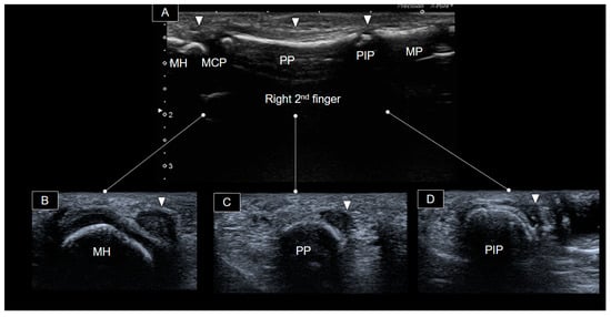 Ultrasound images depicting the palmar aspect of the right 2nd finger in the long axis (A) and at distinct segments (arrowheads) progressing from proximal to distal in the short axis (B–D). MCP, metacarpophalangeal joint; PP, proximal phalanx; PIP, proximal phalangeal joint; MP, middle phalanx; MH, metacarpal head.