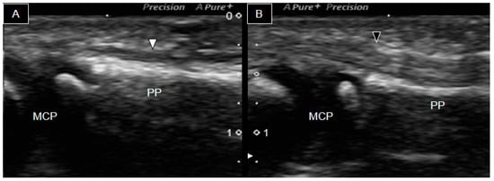 Ultrasound image of the palmar side of the fifth right (A) and left (B) fingers. The white arrowhead indicates the right finger flexor tendon, whereas the black arrowhead indicates the left flexor tendon. MCP, metacarpophalangeal joint; PP, proximal phalanx.