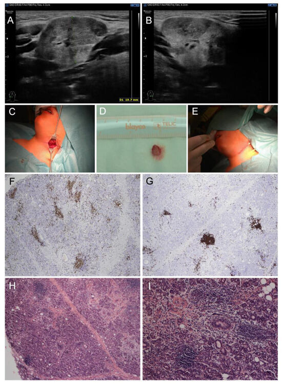Physical examination revealed redness of both eyes, narrowed eyelids, prominent neck enlargement, large and painful solid submandibular salivary glands and submandibular lymphadenopathy. Our patient suffered from ocular dryness (sensation of sand in the eyes). Schirmer test was used to detect ocular dryness. The ophthalmologist recommended local therapy (prednisolone, vitamin A, hyaluronic acid and ectoin) due to ocular surface disease. Ultrasound examination proved enlarged submandibular glands with a rough structure and heterogenous echogenicity (Figure 1A,B). A working diagnosis of “sicca syndrome” with renal involvement was established due to sterile pyuria, elevated protein/creatinine and albumin/creatinine ratios, slightly decreased glomerular filtration rate (GFR), and kidney imaging abnormality. Further, mild erythrocyturia was detected repeatedly. Microalbuminuria was also present. On the other hand, Astrup (acidobasis status) was repeatedly with normal pH. Laboratory findings revealed elevated ESR (up to 110 mm/1st hour), C-reactive protein (CRP, 35 mg/L), leukocytosis (13.88 × 109/L) with neutrophilia, mild elevation in hepatic transaminases, hyperalbuminemia, polyclonal hypergammaglobulinemia, IgE elevation and hypovitaminosis D (25-hydroxyvitamin D level of 20.9 nmol/L). Antinuclear antibody (ANA), rheumatoid factor (RF), anti-extractable nuclear antigens (ENA), anti-Ro/SS-A and anti-La/SS-B autoantibodies were negative. Lupus anticoagulant was positive, while anti-cardiolipin IgG and anti-β2-glycoprotein 1 remained normal. Positron emission tomography (PET)-CT excluded malignancy. Further examination excluded IgG4-related, and other treatment/diseases (history of head and neck radiation treatment, active hepatitis C infection, acquired immunodeficiency syndrome, sarcoidosis, amyloidosis, graft versus host disease). Importantly, nephrology assessment revealed tubulointerstitial nephritis as the most probable diagnosis (sterile pyuria lasting four weeks, infection repeatedly excluded, while renal biopsy not carried out). Labial salivary gland biopsy revealed a focus score of 1, which met the 2016 ACR-EULAR SS classification criteria; however, a small amount of tissue did not allow the pathologist to exclude IgG4-related disease. Thus, a submandibular biopsy was performed and the findings supported the diagnosis of SS and excluded IgG4-related disease. Lymphocytic foci (i.e., foci with more than 50 lymphocytes) were found in the number of 5 per 4 mm2 of tissue in the submandibular salivary gland, resulting in a focus score of 3 (i.e., 2 or more lymphocytic foci per 4 mm2) (Figure 1C–I).