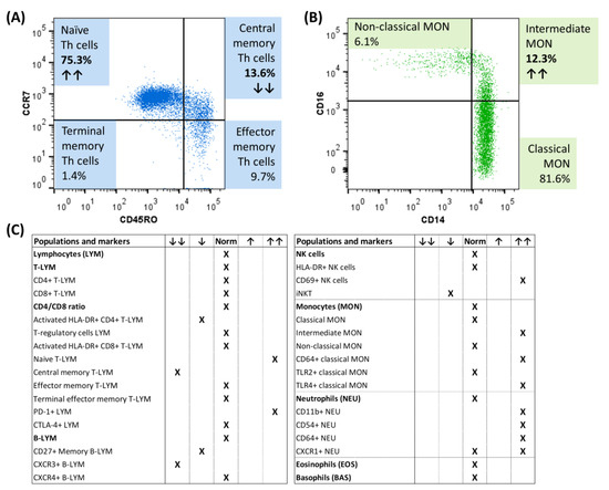 Flow cytometric immunophenotyping of circulating immune cells of a child male with pSS at the diagnosis. (A) Distribution of memory T cell subsets according to CCR7 and CD45RO expression. (B) Representation of monocyte subsets. (C) Overview of the representation of immune populations/subpopulations and their activation in our patient with pSS at the time of diagnosis. ↑↑ indicates an increased relative percentage of the presented subpopulation/increased activation, while ↓↓ indicates a decrease from the healthy controls; CTLA-4+ = cytotoxic T lymphocyte-associated antigen positive, CXCR3+ = chemokine receptor CXCR3 positive, CXCR4+ = chemokine receptor CXCR4 positive, PD-1+ = programmed cell death protein positive, iNKT = invariant NK T cells, TLR2+ = toll-like receptor 2 positive, TLR4+ = toll-like receptor 4 positive.
