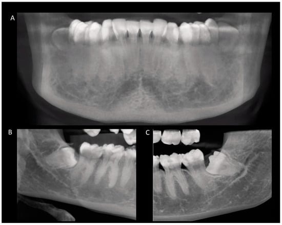 - Peker, I.; Sarikir, C.; Alkurt, M.T.; Zor, Z.F. Panoramic radiography and cone-beam computed tomography findings in the preoperative examination of impacted mandibular third molars. BMC Oral Health 2014, 14, 71. [Google Scholar] [CrossRef] [PubMed]